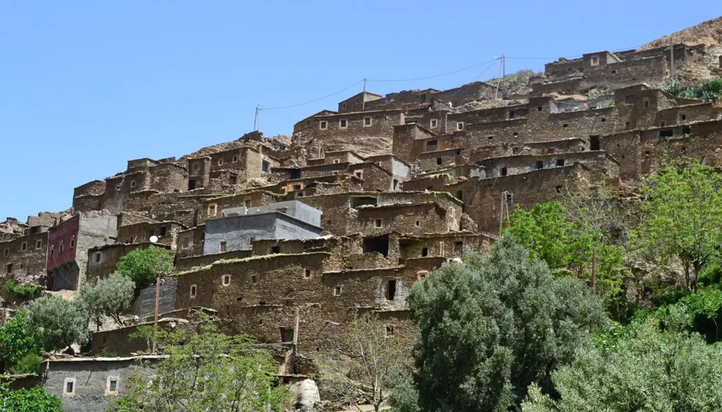15:15: Depart from Azro Ofolous village, walking downhill or on the level. Pass by the beautiful villages of Tizgui and Ait Ouskri. the hike continues by crossing a river towards Sidi Hssayn Village.