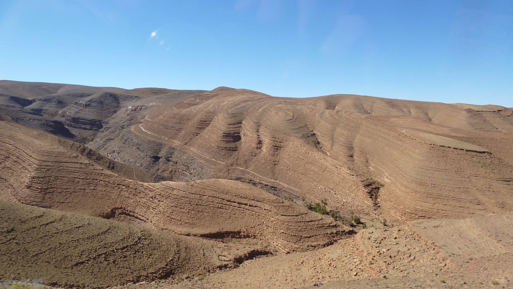 Climbing out of Ouarzazate, the road snakes as you ascend towards the Tizi-n-Tiniffifft Pass (1,660m). At the Pass an awesome overlook allows you to view deep water cut canyons. The river here has deeply incised the valley in the past and during flash floods of today, developing a polished rock channel floor; fascinating. It is a mini Grand Canyon! Look out too for the “eye” and the “heart”, weathered rocky outcrops as you travel onwards from this area.